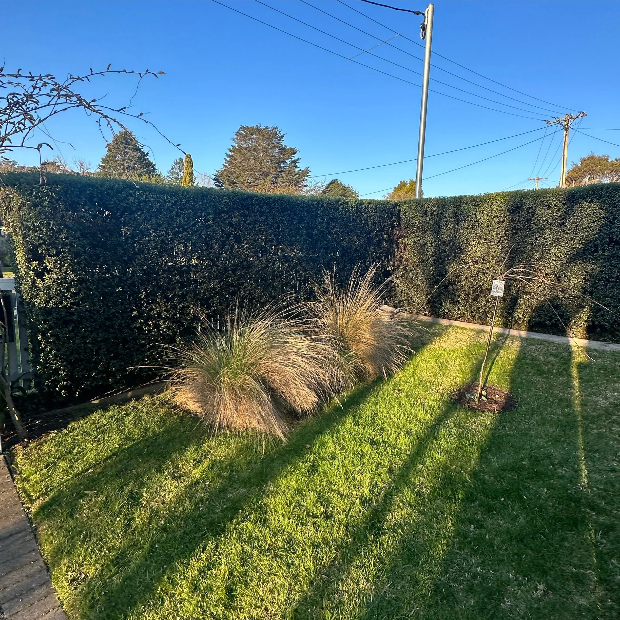 A neatly trimmed hedge behind a small garden bed with ornamental grass and a young tree, casting long shadows in bright sunlight, with a clear blue sky overhead.